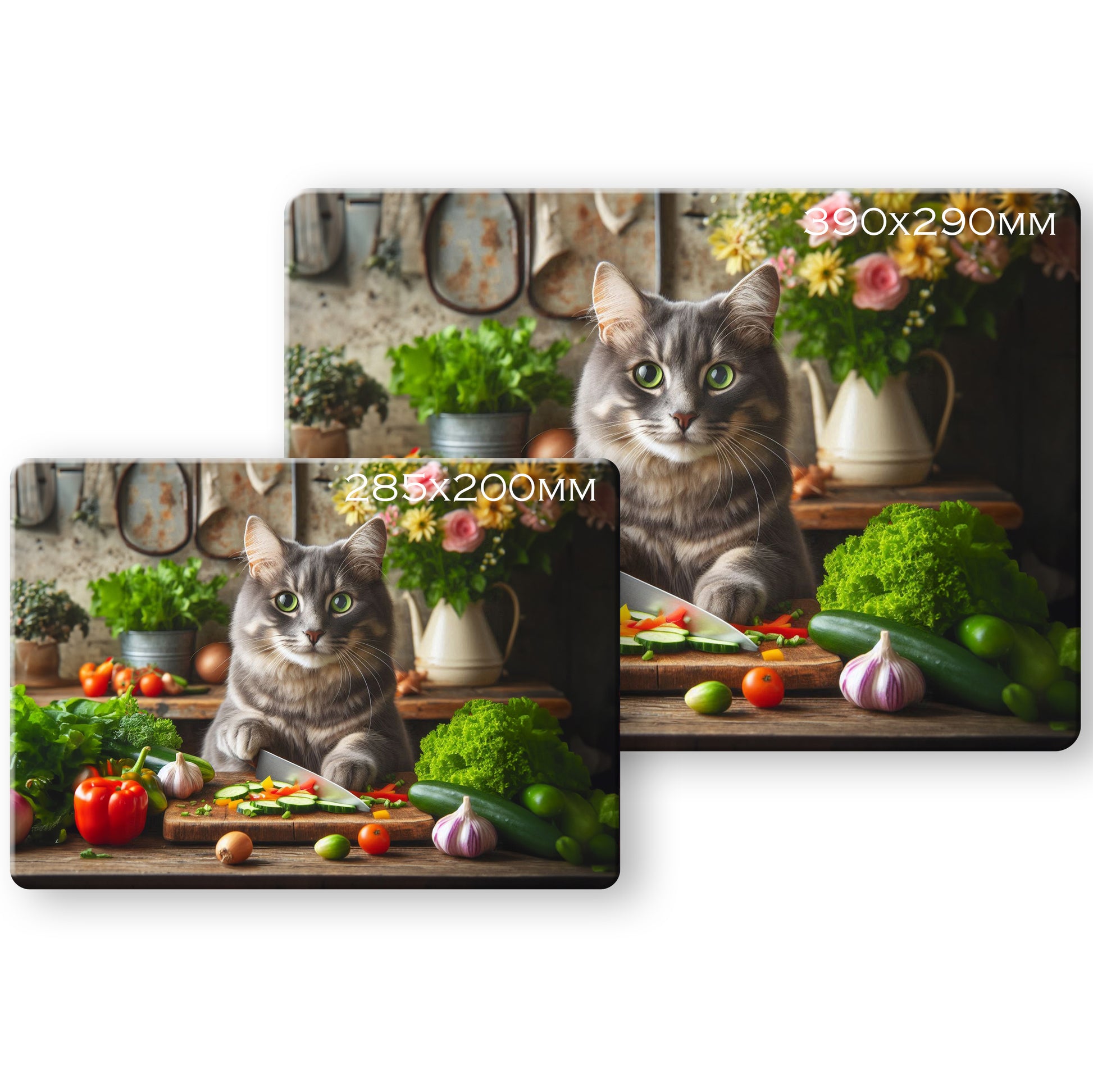 Cats in the Kitchen (8 styles) - Tempered Glass Cutting Board - (285x200mm and 390x290mm) Gloss or Textured Finish Grey Tabby